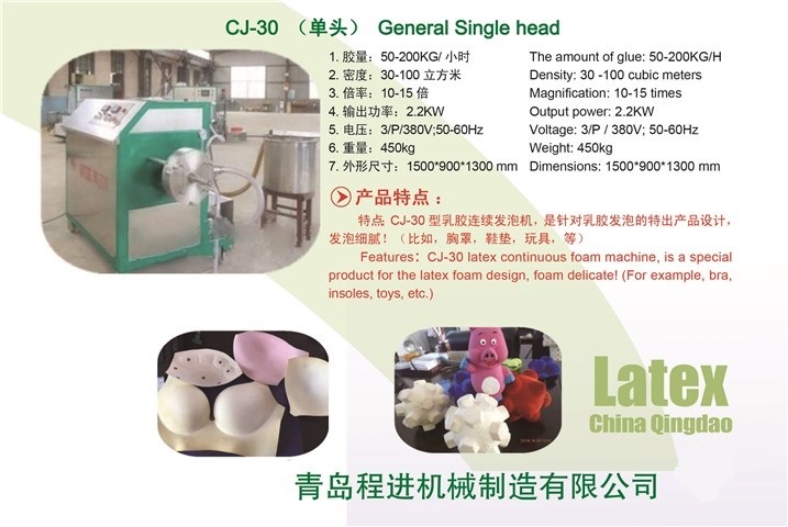 CJ-30型乳膠連續發泡機適應于乳膠粉撲、乳膠鞋墊,乳膠玩具,乳膠文胸等小型乳膠產品。